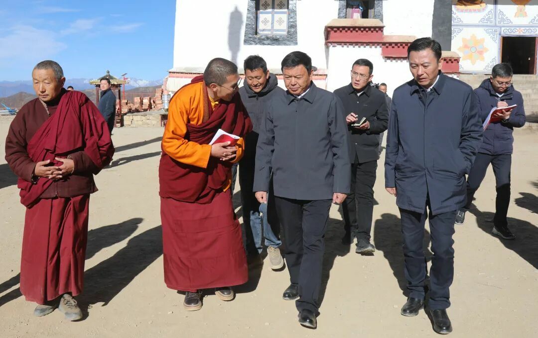图为李富忠在加查县达拉岗布寺调研寺庙管理、文物保护、“三个意识”等工作。