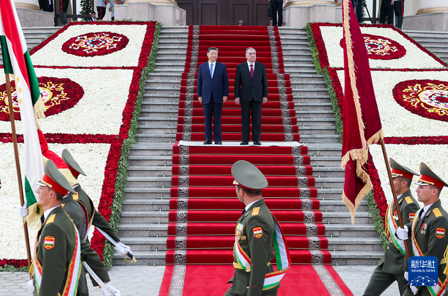 当地时间7月5日下午,国家主席习近平同塔吉克斯坦总统拉赫蒙在杜尚别总统府举行会谈。拉赫蒙为习近平举行盛大隆重的欢迎仪式。