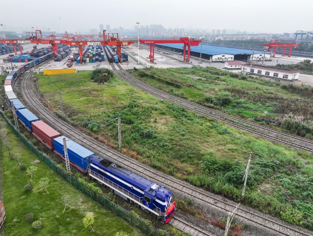 第10万列中欧班列——X8083次中欧班列(重庆—杜伊斯堡)11月15日从重庆团结村中心站开出,驶往德国杜伊斯堡。十年前,习近平主席对德国进行国事访问期间参观杜伊斯堡港,见证了一列从中国重庆始发的班列满载货物抵达。