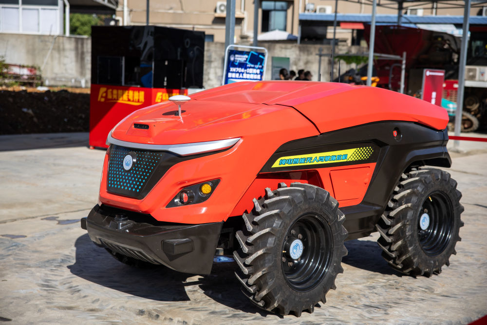 “起步、前进……”随着工作人员的口令和指挥,一台由湖南省农业装备研究所研制的智能无人驾驶拖拉机展示起停、转弯、掉头等功能。这台机器功能多样,能够实现除草、施肥和旋耕等,能应用于设施农业和果园。