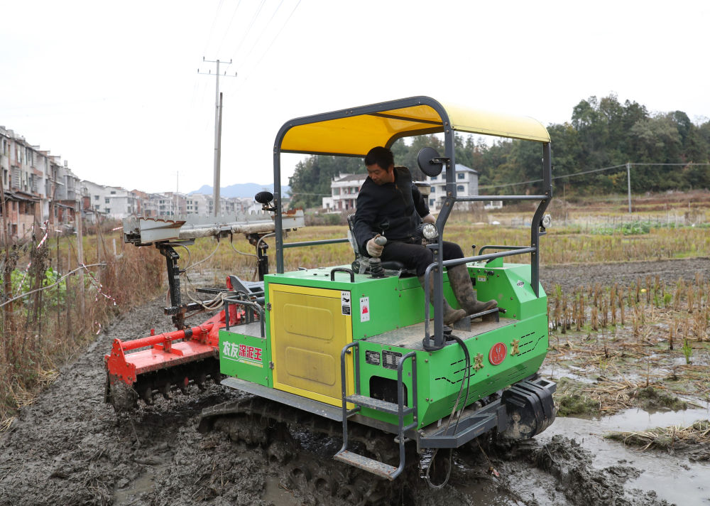 2024年11月26日,在湖南省娄底市双峰县荷叶镇,一名农机手在驾驶旋耕机。新华社记者 王婧嫱 摄