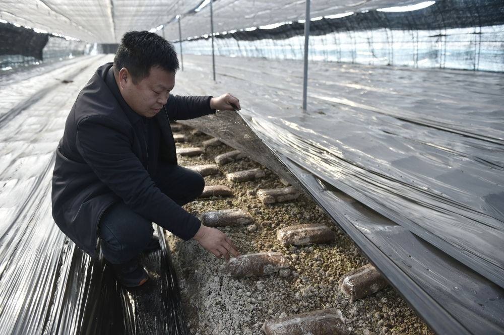 2024年1月11日,村民在河南省宝丰县周庄珍稀菌产业园的羊肚菌种植大棚内查看生长情况。周庄珍稀菌产业园按照“企业+合作社+农户”的运营模式,积极发展乡村特色种植产业。新华社记者 鲁鹏 摄