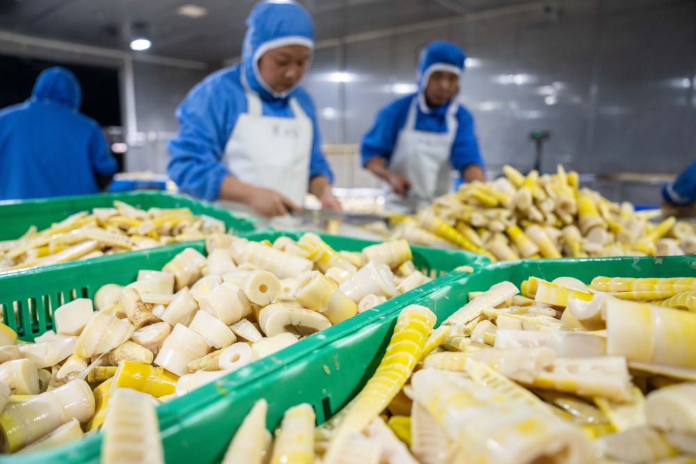 2024年11月27日,工人在湖南省益阳市桃江县马迹塘镇笋竹特色产业园内一家鲜笋加工企业生产车间加工鲜笋。竹笋产业是桃江县的传统特色产业,当地依托丰富的竹林资源,积极发展竹笋深加工产业。新华社记者 陈思汗 摄