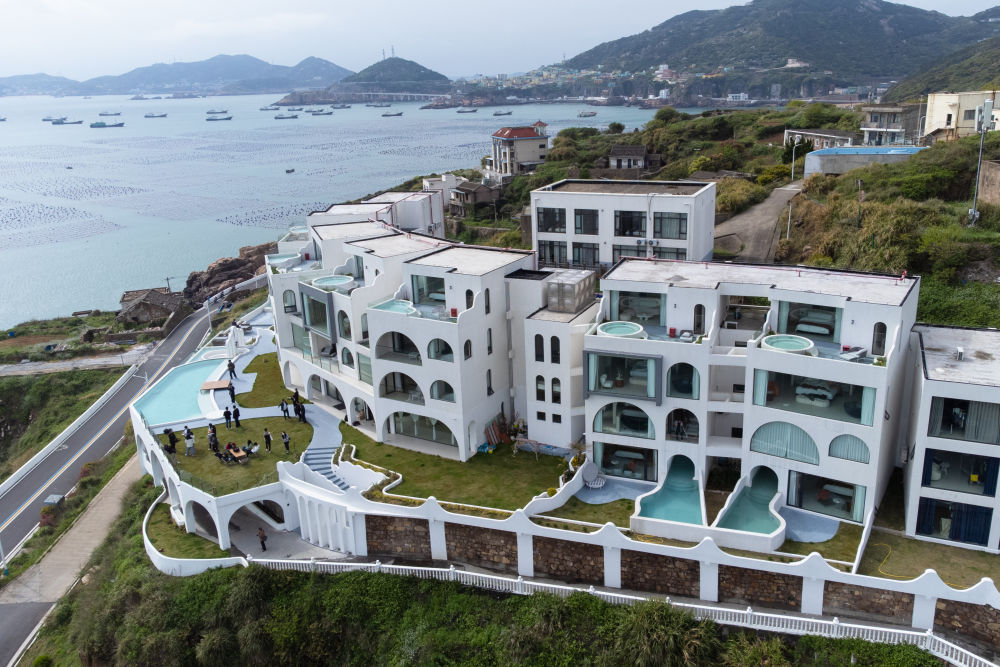 2024年4月21日在浙江省舟山市嵊泗县泗洲塘村拍摄的共富民宿集聚区(无人机照片)。近年来,嵊泗县持续推进“千万工程”美丽海岛渔村建设,通过渔村环境整治、节点景观提升、休闲街区打造等措施将海岛美景串珠成链。新华社发(姚凯乐 摄)