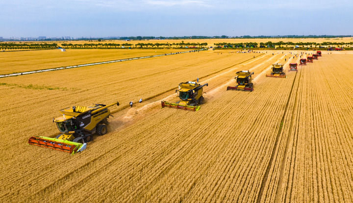 2024年5月29日,在河南省驻马店市西平县老王坡高标准农田,机收编队在收获小麦。新华社发(赵永涛 摄)