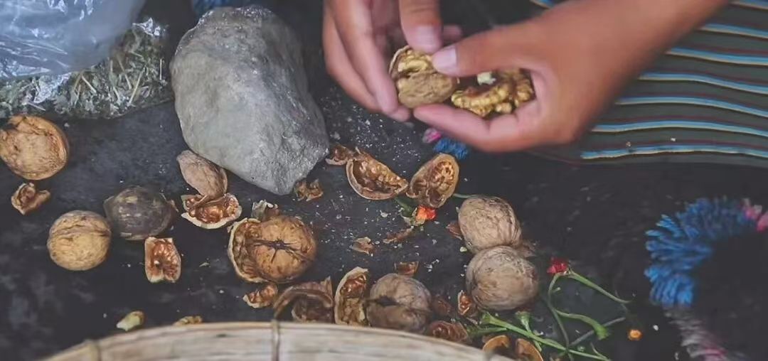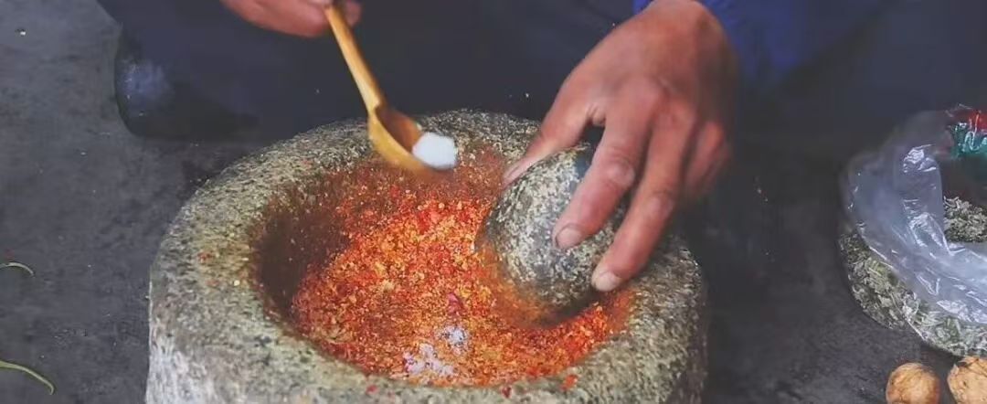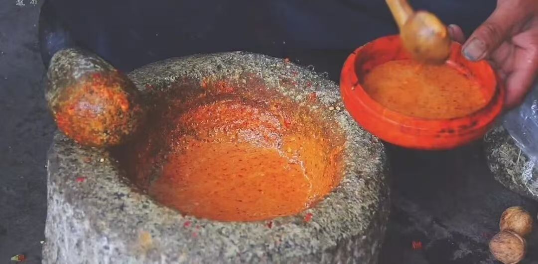 “哐哐哐……哐哐哐……”藏家的石臼里,一场“味觉碰撞”正在上演:加查本地的红辣椒晒得干瘪,被石杵捶出辛辣香气;紧接着,剥好的核桃仁被丢进去,油脂在撞击中渗出,渐渐将辣味包裹。没一会儿,辛辣的“暴脾气”就被核桃的“醇厚”驯服,变成了红亮绵密的酱料,光闻着就让人咽口水。