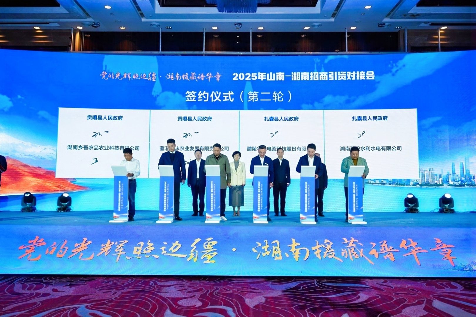对接会现场共进行三轮集中签约,签约项目15个,意向投资金额近9亿元,涉及文旅融合、现代农业、环保科技、电商服务等多个领域,推动藏湘韵味高原食品加工、玉麦湘藏香猪养殖等现有合作项目升级,进一步拓展“藏品入湘、湘客游藏”长效合作机制。