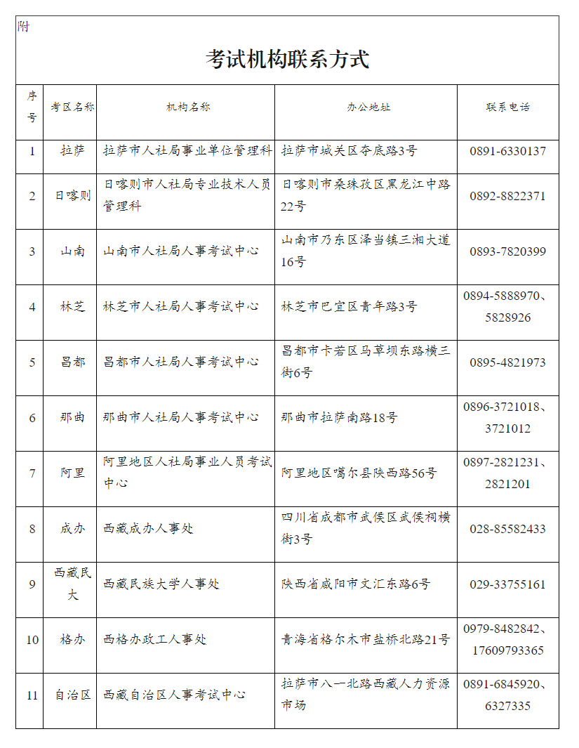 考试设拉萨、日喀则、山南、林芝、昌都、那曲、阿里、成办、格办、西藏民族大学10个考区。考试实行属地化管理,考生原则上在现工作地所在考区报名参加考试。