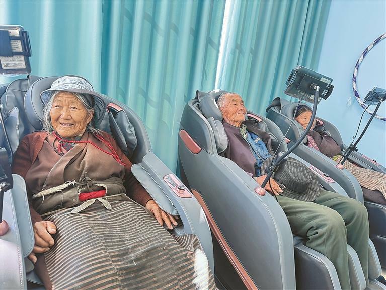 图为琼结县下水乡措杰村的老人们在智慧居家服务驿站康养区按摩椅上按摩。本报记者 巴桑旺姆 摄