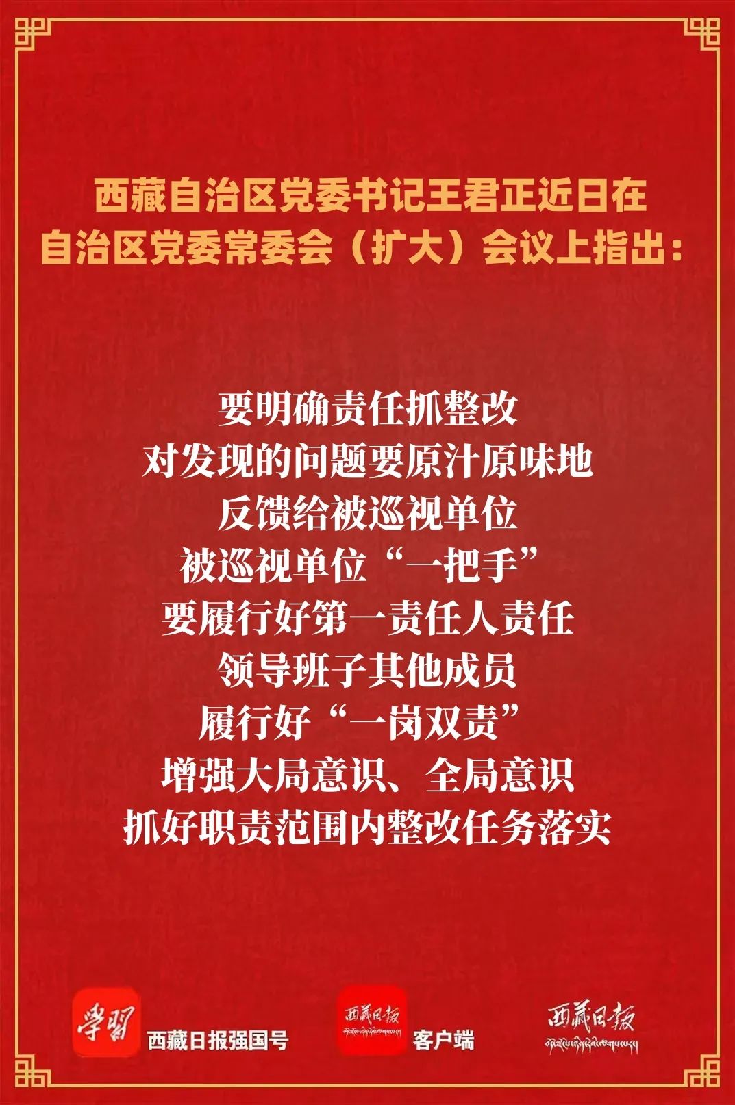 会议听取了十届自治区党委第四轮巡视整改情况和第六轮巡视情况汇报。王君正指出,巡视是一场“政治体检”、一次党性锤炼,巡视整改是巡视的“后半篇文章”、是巡视监督成效的关键。各级党委(党组)要深入学习领会习近平总书记关于巡视工作的重要指示精神,把巡视整改作为拥护“两个确立”、践行“两个维护”的实际行动,深化政治巡视,以巡促改、以巡促建、以巡促治,严肃查处通报典型案例,以对党和人民高度负责的态度抓好巡视工作,切实发挥巡视利剑作用,确保中央巡视工作的基本方针落到实处、见到实效。要明确责任抓整改,对发现的问题要原汁原味地反馈给被巡视单位,被巡视单位“一把手”要履行好第一责任人责任,领导班子其他成员履行好“一岗双责”,增强大局意识、全局意识,抓好职责范围内整改任务落实。要协调联动抓整改,被巡视单位要切实扛起整改主体责任,主动加强沟通联络;分管领导要加强督促指导,推动各部门积极履行职责、合力抓好整改。要明确任务抓整改,强化对巡视整改全过程领导、全方位统筹,建立健全整改机制,举一反三、延伸拓展,既着力“当下改”又着眼“长久立”,做到解决一类问题、完善一套制度,更好发挥巡视标本兼治作用。要强化监督抓整改,纪检监察机关、组织部门要落实整改全面监督责任、日常监督责任,把日常督促和检查抽查结合起来,及时开展“回头看”,强化精准督查,增强督查实效,推动真改实改。要巩固成效抓整改,把巡视整改同正在开展的深入贯彻中央八项规定精神学习教育结合起来,同全面从严治党、重点工作、干部队伍建设结合起来,进一步完善工作机制,堵塞工作漏洞,严肃工作纪律,切实推动整改成效转化为治理效能,努力提升建设社会主义现代化新西藏的能力水平。