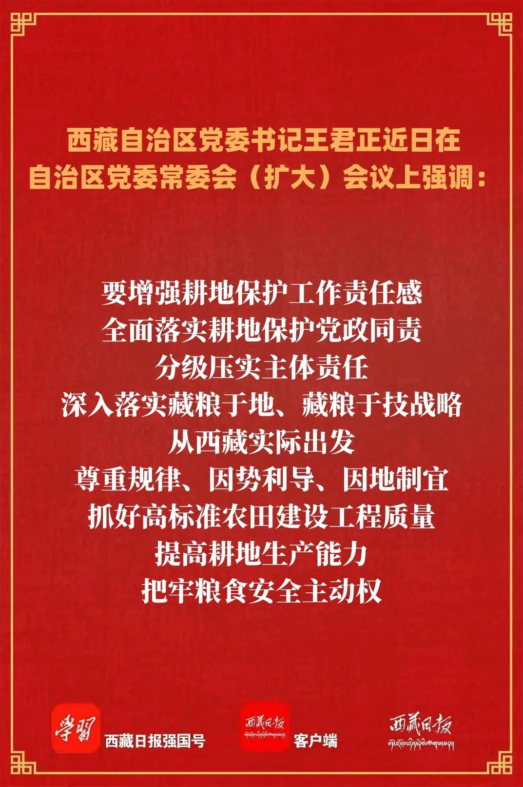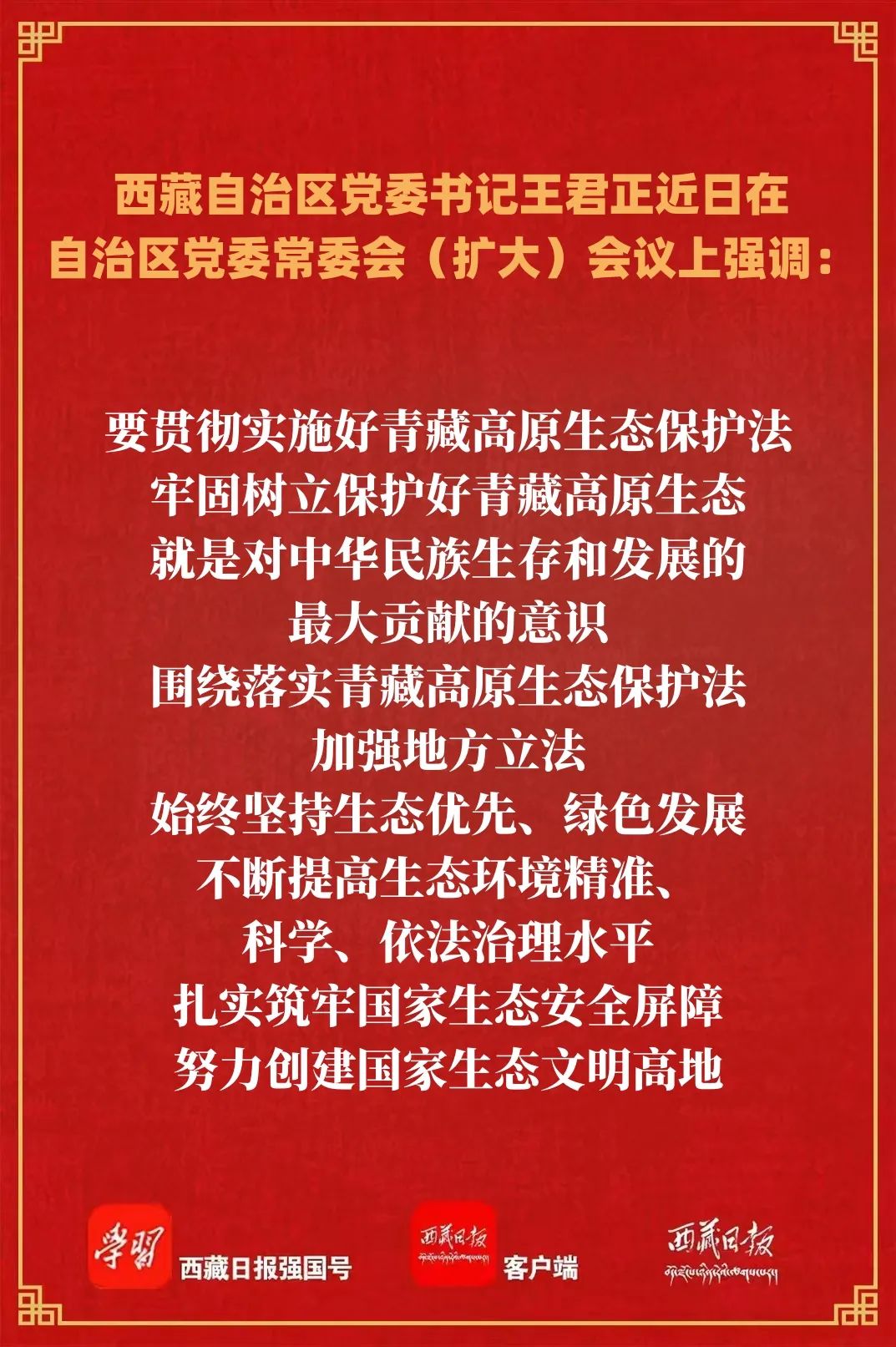 王君正强调,要贯彻实施好青藏高原生态保护法,牢固树立保护好青藏高原生态就是对中华民族生存和发展的最大贡献的意识,围绕落实青藏高原生态保护法,加强地方立法,始终坚持生态优先、绿色发展,不断提高生态环境精准、科学、依法治理水平,扎实筑牢国家生态安全屏障,努力创建国家生态文明高地。要增强耕地保护工作责任感,全面落实耕地保护党政同责,分级压实主体责任,深入落实藏粮于地、藏粮于技战略,从西藏实际出发,尊重规律、因势利导、因地制宜,抓好高标准农田建设工程质量,提高耕地生产能力,把牢粮食安全主动权。