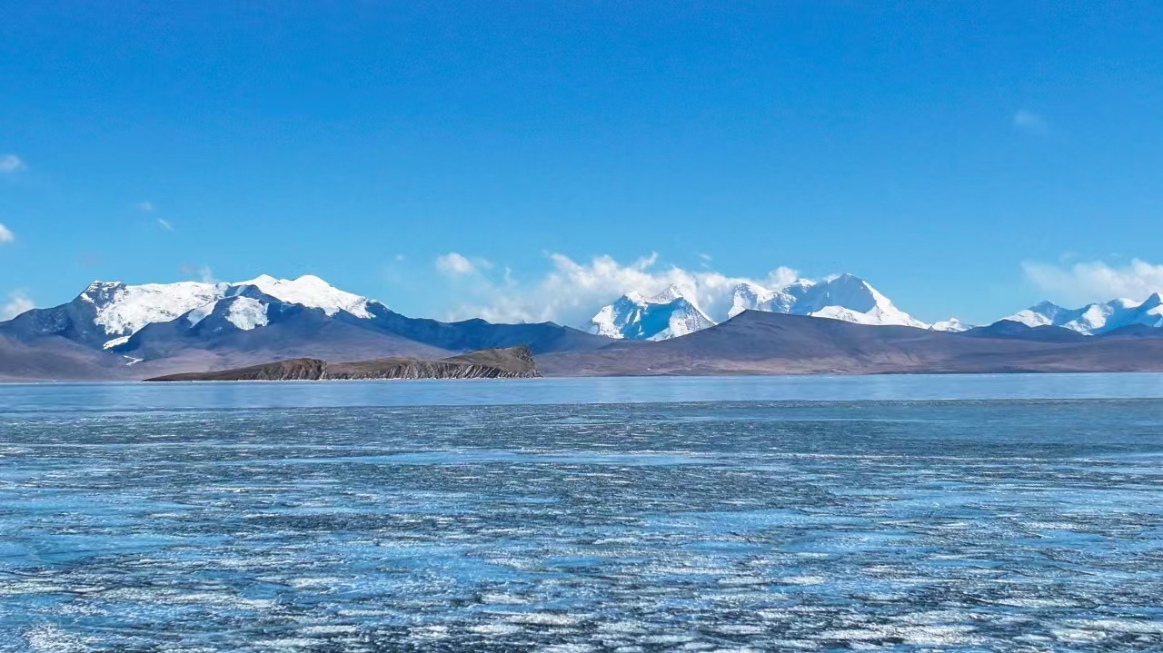 冬季的普莫雍措湖面结冰,形成了绝美的蓝冰,那湛蓝的颜色,仿佛是从湖底涌起的梦幻色彩,每一道冰痕、每一颗凝固的气泡,都是大自然的 杰作,站在冰面上,仿佛置身于童话世界。