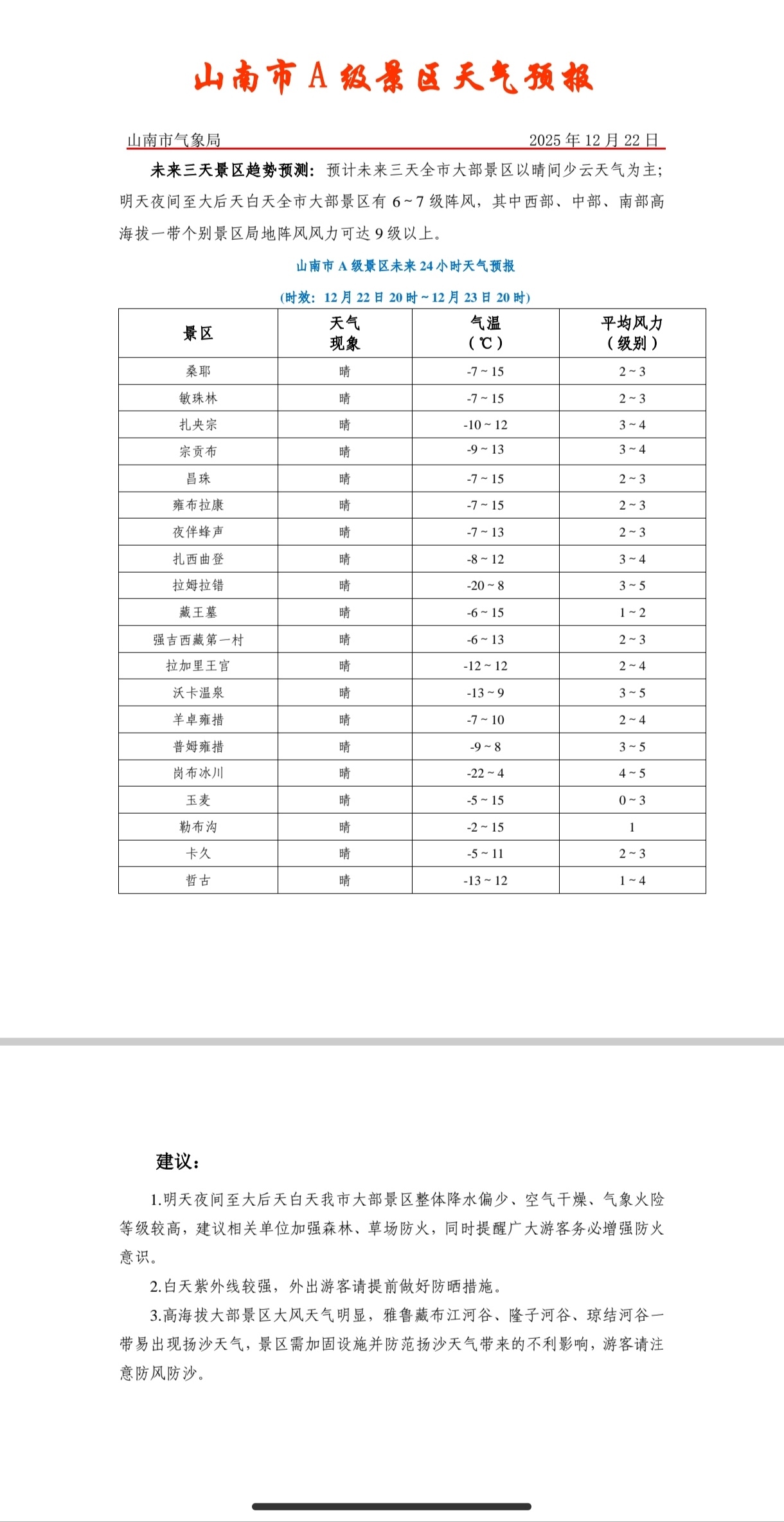 山南市A级景区天气预报