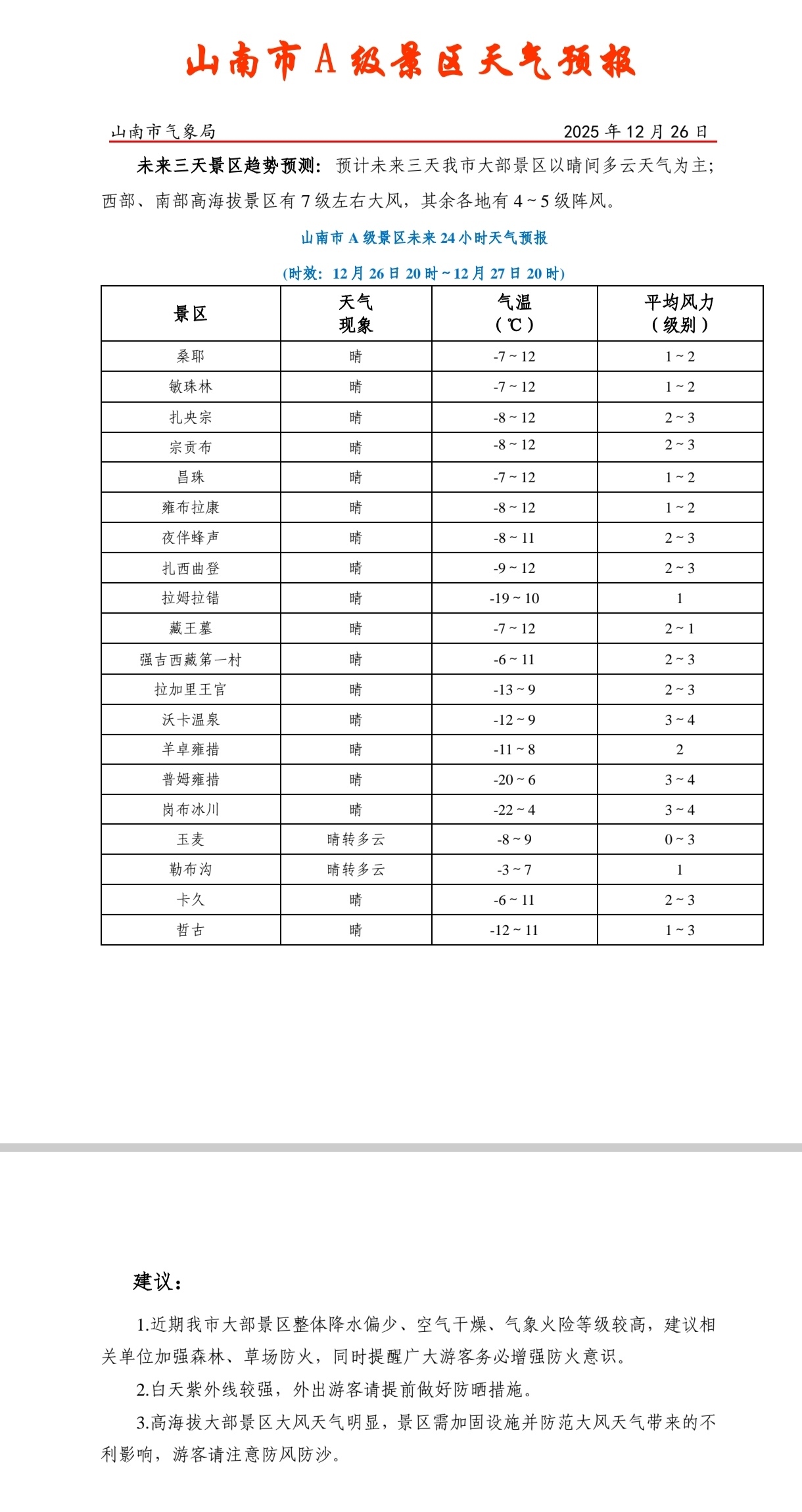 山南市A级景区天气预报