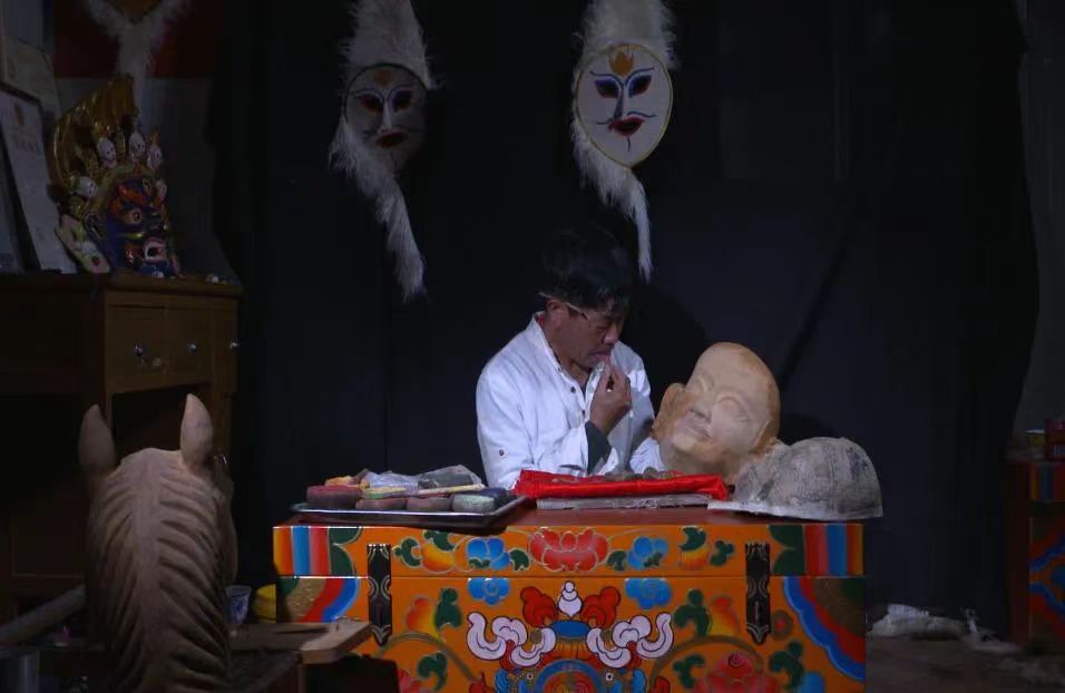 在山南贡嘎县乃萨村里的一个作坊里,年近花甲的第五代传承人旺久多吉在角落的泥台上雕刻着面具的五官。