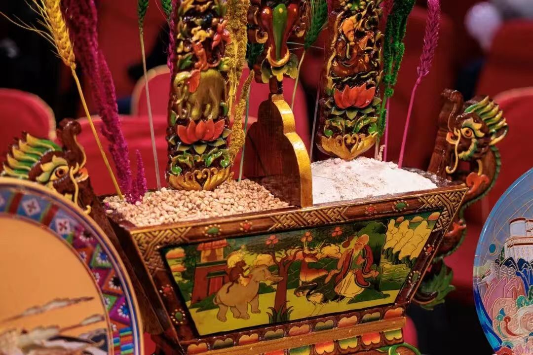 为预祝新年粮食丰收,家家户户会培育青稞青苗,敬供于佛龛前的双柜之上。十二月中旬,各家陆续以清油、面粉炸制名为“卡赛”的各式果子。临近岁末,每家都要精心准备“竹素切玛”(五谷斗),内盛用酥油拌好的糌粑和炒麦粒,并插上象征吉祥的五彩青稞穗;同时备好彩色酥油塑成的羊头“洛果”。这些物品皆寓意喜庆丰收、祈愿来年风调雨顺、人畜兴旺。