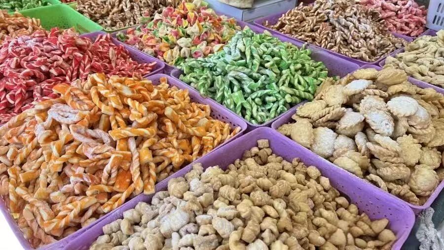 除夕之夜,各家再次彻底清扫,客厅铺设新“卡垫”。柜上叠放多层“卡赛”组成“碟卡”,其前摆放七只小碗,盛放“卓玛只森”、牛奶、青稞酒、清茶、干果等;一侧安置“竹素切玛”,另一侧摆放大块酥油、砖茶、盐巴等物。桌上亦摆满风干牦牛肉、各色水果干果,琳琅满目,喜迎新春。