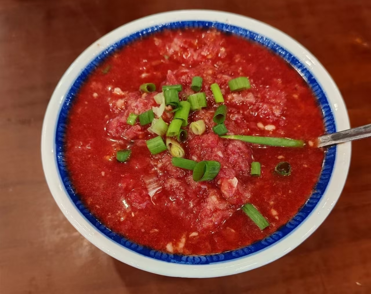 生牛肉酱是山南地区用于招待宾客的特色菜肴。其主要原料为高原牦牛肉,肉质鲜美且富有嚼劲,蛋白质含量较高。制作时,将新鲜牦牛肉剁碎成酱,与当地特有的藏式辣椒等香料混合调味,形成风味浓郁、口感独特的酱料。该菜肴味道鲜明,辣味突出,体现了山南地区喜食辛辣的饮食特点。