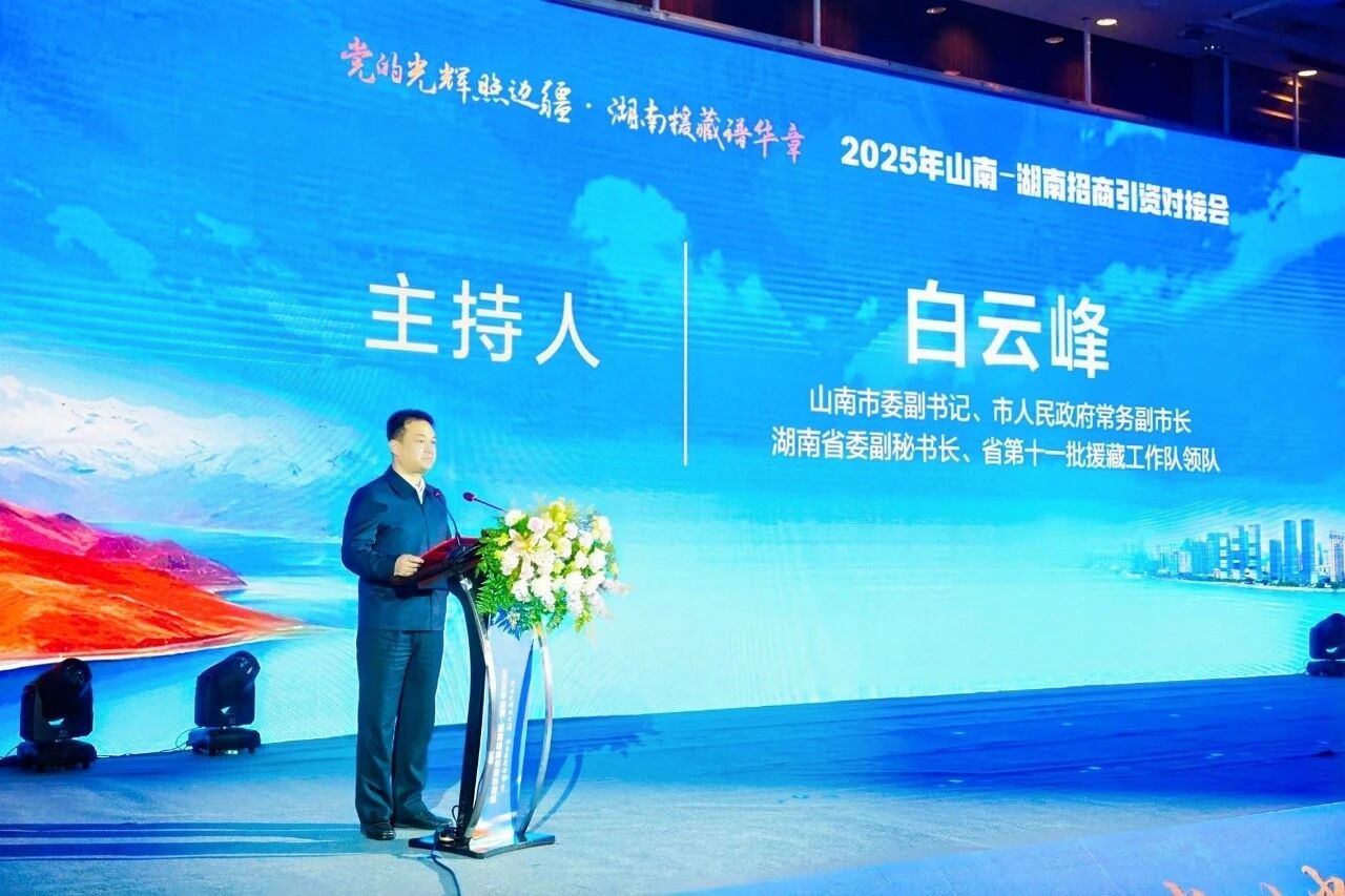 11月24日,以“党的光辉照边疆·湖南援藏谱华章”为主题的2025年山南-湖南招商引资对接会在湖南长沙成功举办。来自湘藏两地相关部门、企业界代表近200人齐聚一堂,共话合作机遇,共绘发展蓝图。此次活动由湖南省委、省政府大力支持,湖南省第十一批援藏工作队牵头组织,为深化湘藏交往交流交融、推动山南市招商引资高质量发展注入强劲动力。山南市委副书记、常务副市长,湖南省委副秘书长、湖南省第十一批援藏工作队领队白云峰主持会议,湖南省文旅厅党组书记、厅长李爱武出席并致辞。