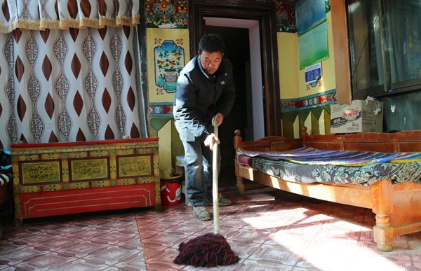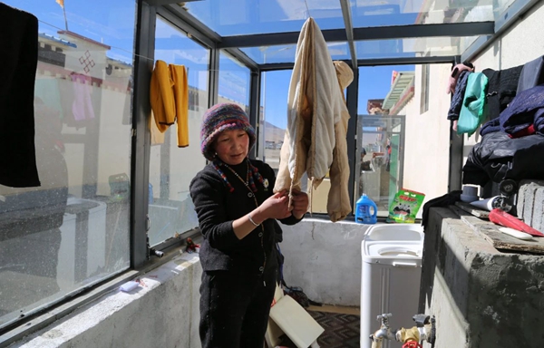“2018年的时候,这里只有十几户才有一个集中取水点,冬天天气冷的时候,水会冻住,水管也会破裂。自从建了玻璃房以后,水管不容易破,不管是洗衣服,还是取水都特别方便。玻璃房里还能晾晒衣服,再也不用担心洗完的衣服被风吹跑或者弄脏了。”措赤德烈拧开水龙头洗了个拖把,喜悦之情涌上心头。