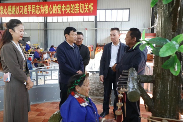 图为李富忠在哗叽手工编织专业合作社详细了解合作社非遗传统纺织技艺“泽帖尔”生产销售、带动群众增收、残疾人就业等情况。