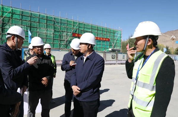 图为李富忠在乃东区西区农贸市场项目现场,详细了解项目建设存在的困难和问题。