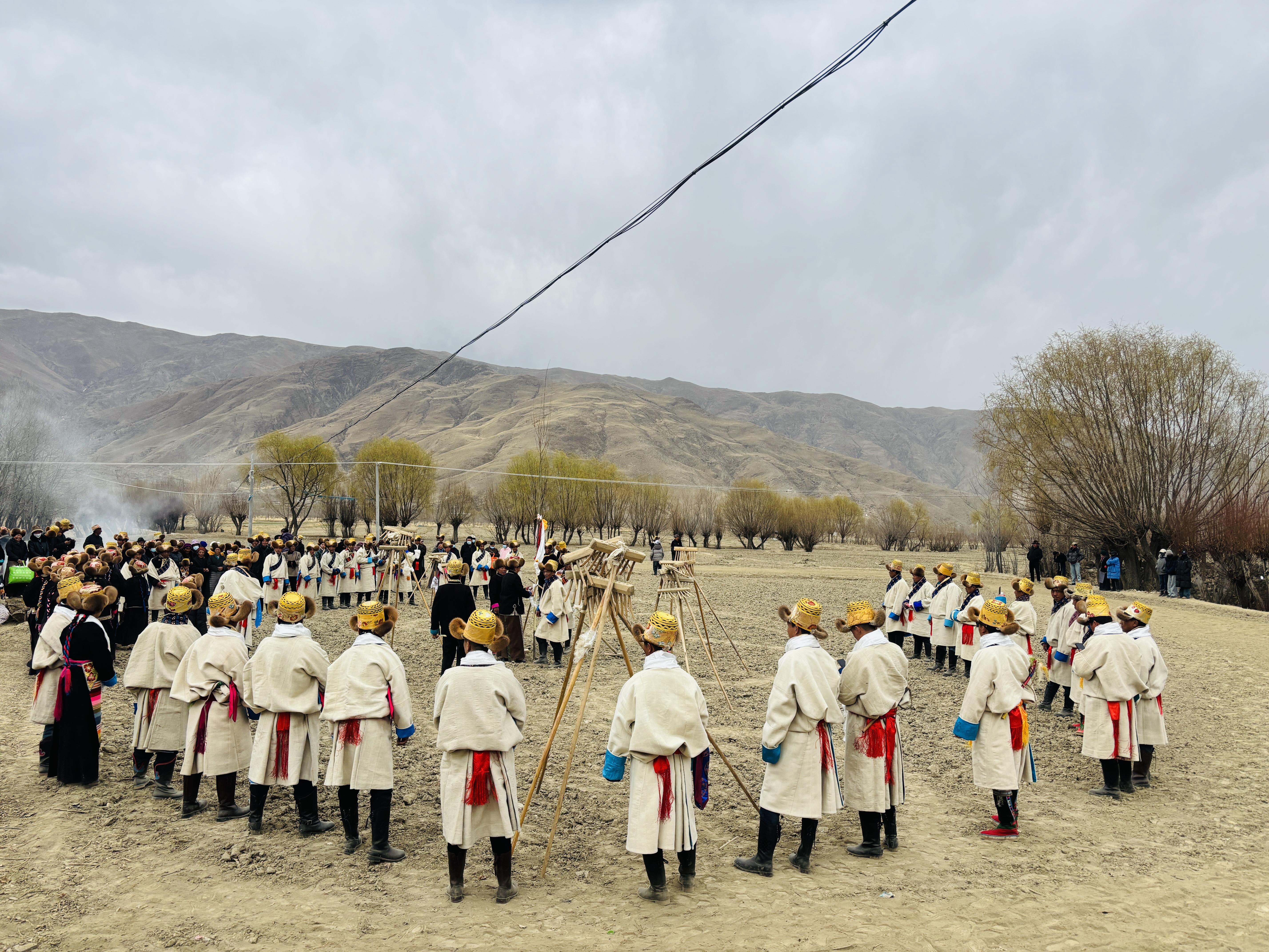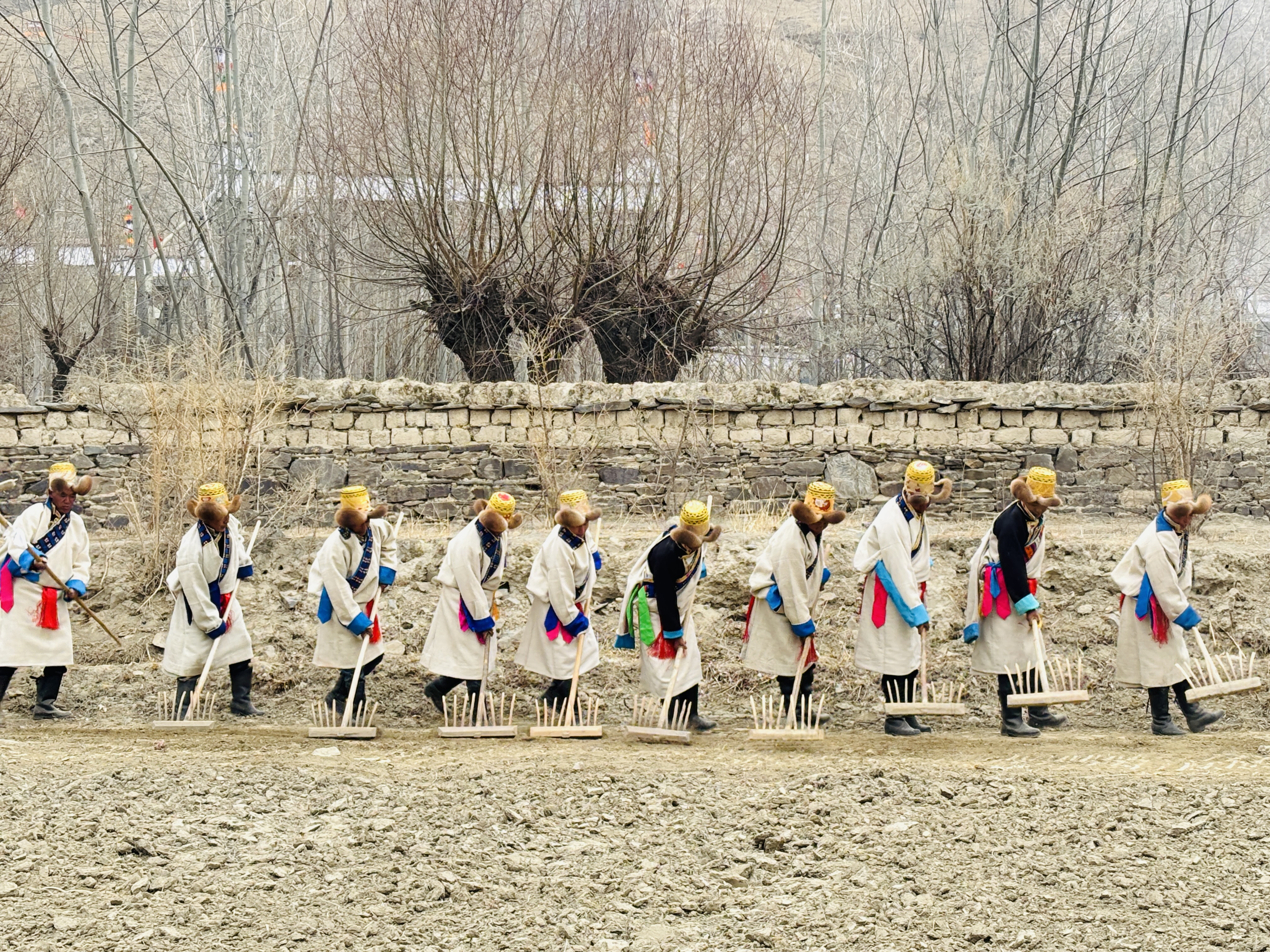 仪式现场好不热闹,田间摆满了象征吉祥丰收的“切玛”盒,村民们手捧青稞酒,将手中的糌粑撒向天空,高声呼喊着祝福的话语,祈求新的一年风调雨顺、五谷丰登。