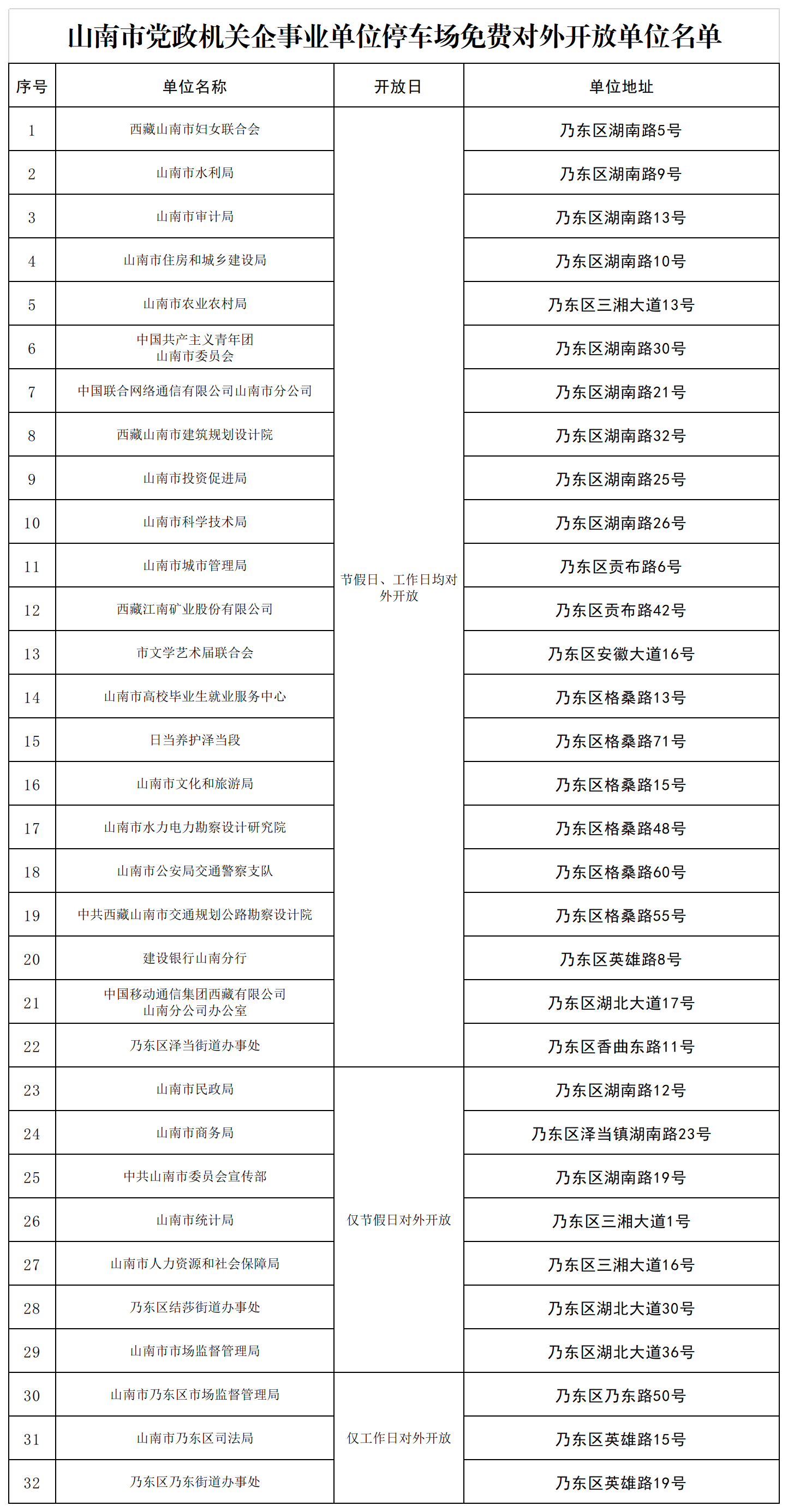 附件:山南市党政机关企事业单位停车场免费对外开放单位名单