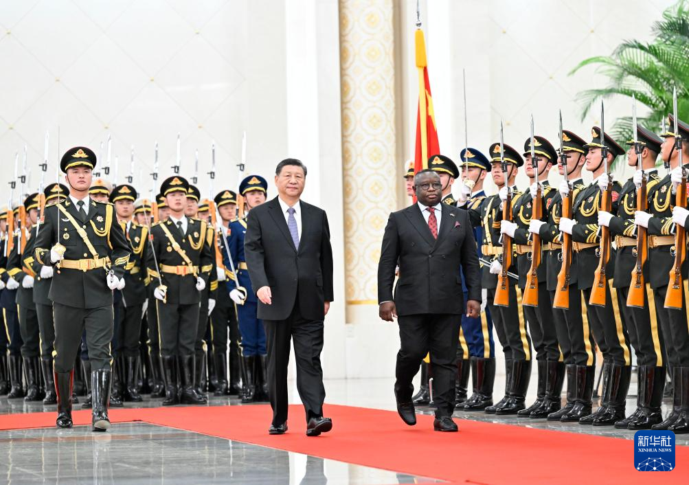 会谈前,习近平和夫人彭丽媛在人民大会堂北大厅为比奥和夫人法蒂玛举行欢迎仪式。