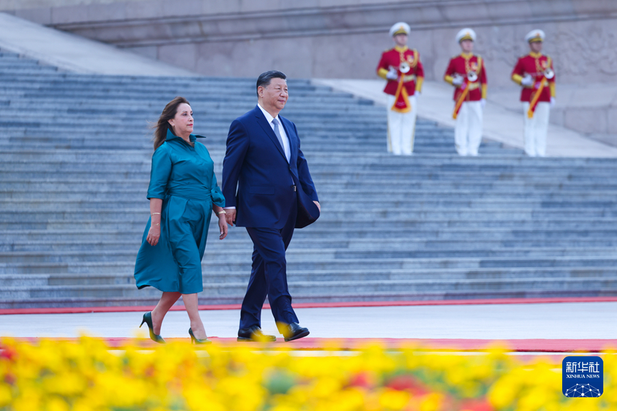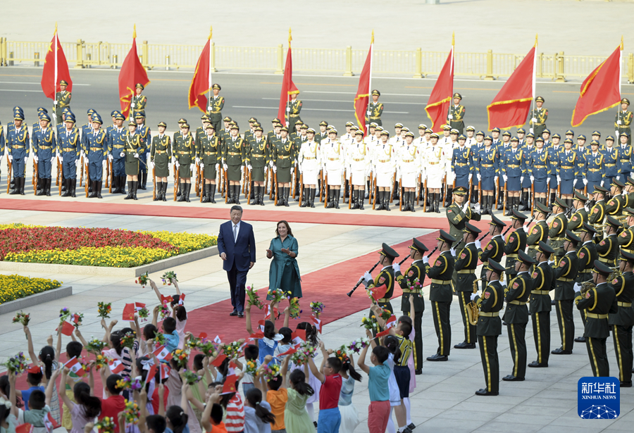 6月28日下午,国家主席习近平在北京人民大会堂同来华进行国事访问的秘鲁总统博鲁阿尔特举行会谈。这是会谈前,习近平在人民大会堂东门外广场为博鲁阿尔特举行欢迎仪式。