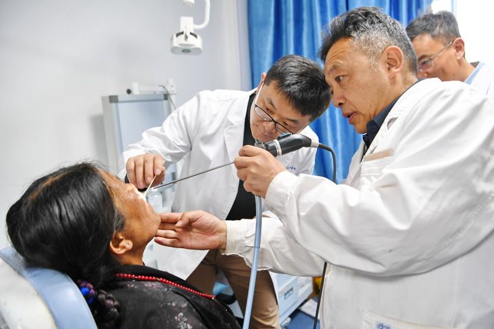 中国医学科学院整形外科医院王克明博士(左后)和西藏自治区人民医院巴罗主任(右前)为患者查体(2024年8月27日摄)。新华社记者 张汝锋 摄