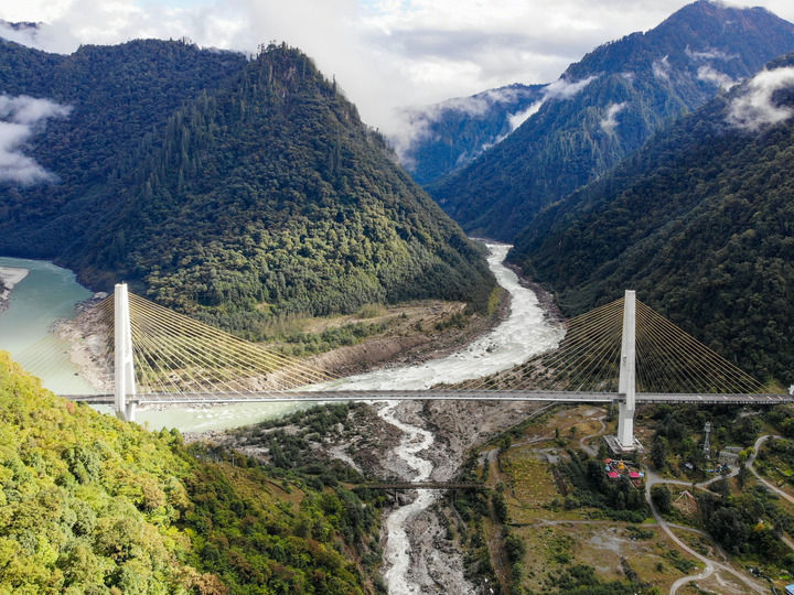 2019年10月27日拍摄的川藏公路通麦路段上的迫龙沟特大桥(无人机照片)。迫龙沟特大桥位于西藏林芝市波密县境内,是西藏自治区内最大的公路双塔斜拉桥。新华社记者 孙非 摄