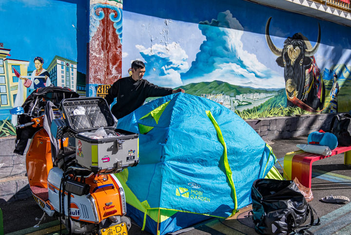 经国道318线前往西藏旅游的重庆游客张静在芒康县如美镇拉乌村整理帐篷(2023年10月20日摄)。新华社记者 孙非 摄