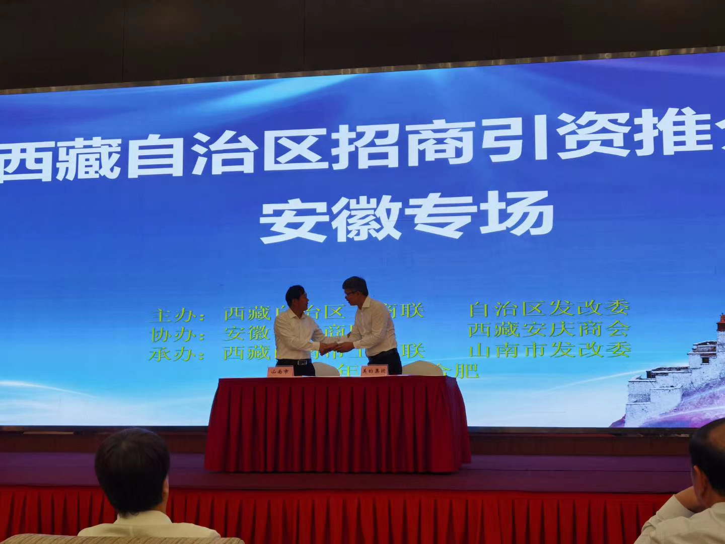 按照自治区工商联《关于组织人员赴援藏省市开展招商引资和对口援藏对接工作的通知》要求,9月27日上午,由山南市工商联联合市发改委举办的2020年安徽省对口援藏招商引资推介会在安徽省合肥市举办。西藏自治区政协副主席、区工商联主席、总商会会长阿沛·晋源出席并讲话,安徽省副省长、省工商联主席王翠凤致辞,自治区发改委和山南市发改委作了政策解读和招商引资项目推介。自治区工商联党组成员、副主席陆红军主持推介会。推介会签约了2个项目,投资额达11亿元。