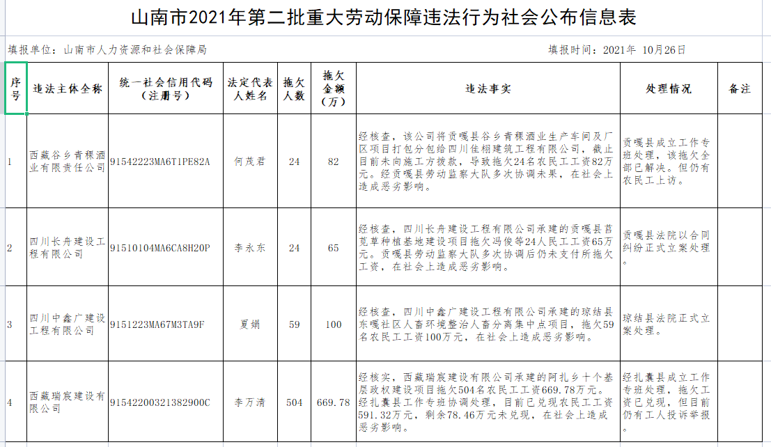 经市根治拖欠农民工工资工作领导小组研究同意,现将《山南市2021年第二批重大劳动保障违法行为社会公布信息表》印发给你们,请知悉。