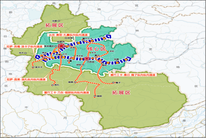 依托“两横五纵”交通骨架,密切拉萨河经济带与雅鲁藏布江中游经济带的纵向联系,加强核心区相邻区域经济合作,构建核心区与拓展区互联互通、联动发展格局。