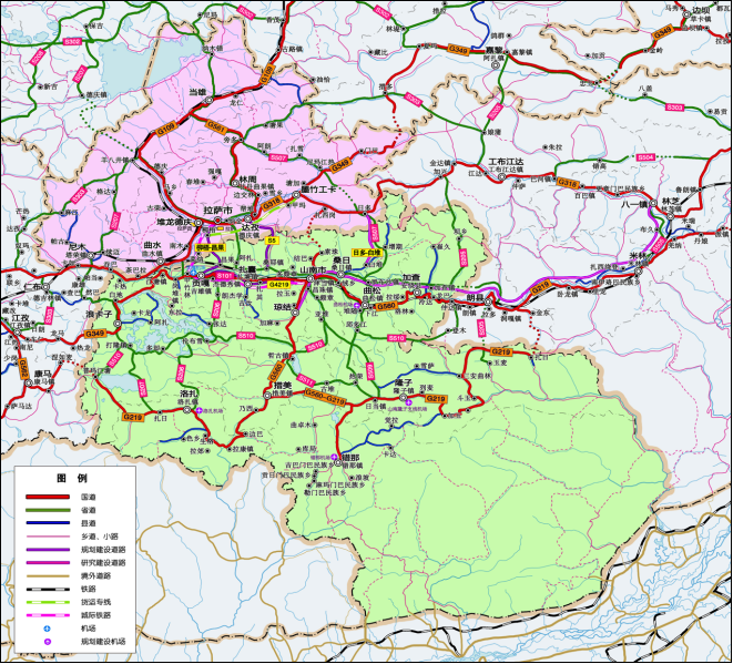 专栏2 综合交通运输近期重点工程 公路交通。S5拉萨(达孜)至山南(桑耶)快速通道,G349泽当至贡嘎机场改建工程、墨竹工卡至乃东段改造工程,G219普玛江塘至朗县金东乡改建工程,G560线琼结至错那段改建工程,加快实施G318线升级改造工程、G318、G109线拉萨绕城公路工程,推进拉萨至林周隧道工程、柳梧至昌果快速通道建设。 客运枢纽场站。新建拉萨市东嘎镇、东城区、墨竹工卡、桑耶镇客运站,改扩建泽当、达孜客运站。 轨道交通。拉林铁路拉萨至山南段,拉萨市柳梧新区—墨竹工卡县货运专线,拉萨市有轨电车交通项目。 机场建设。加快推进拉萨贡嘎机场航站区改扩建工程、隆子机场前期工作。规划建设达孜、曲松、洛扎、错那等通用机场。 |